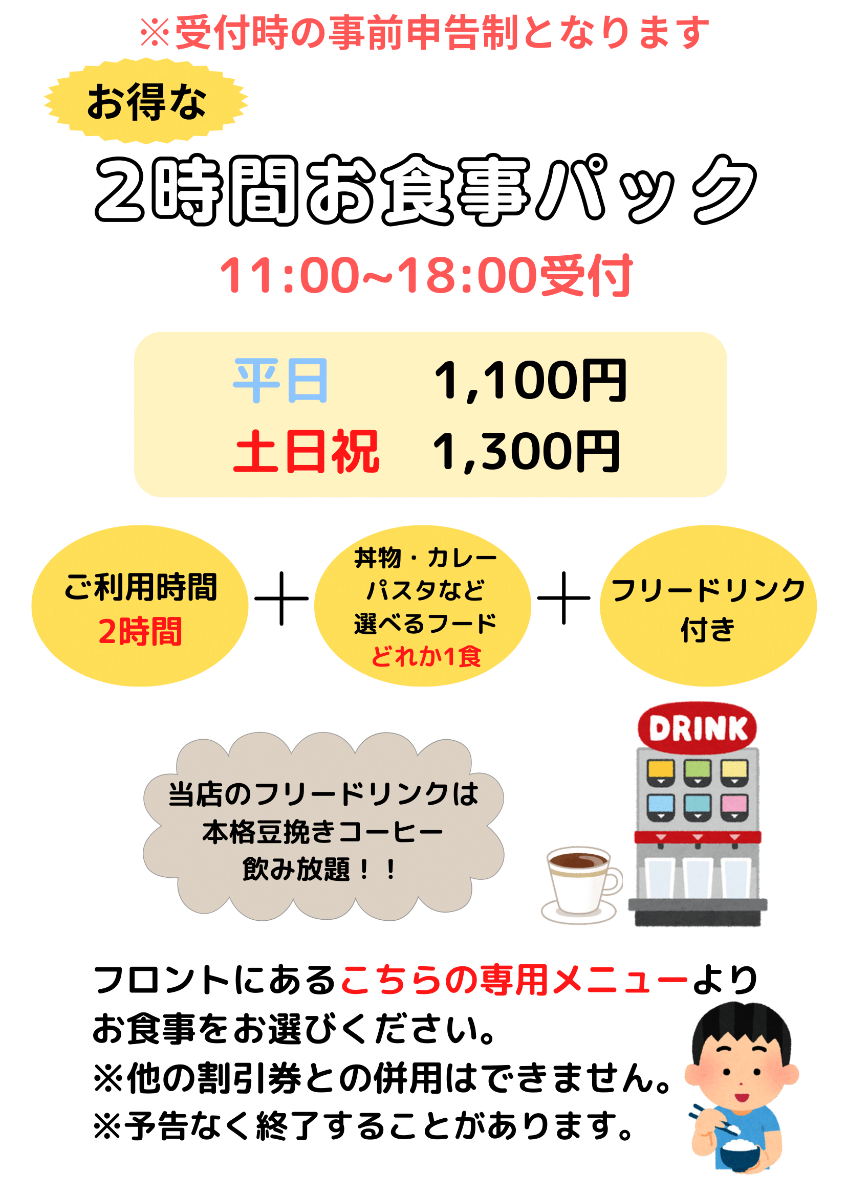 - 自由に席移動は出来ますが、カウンター内にて席管理をしておりますので、席移動の際は御手数ですが必ず受付カウンターへお申し出ください。