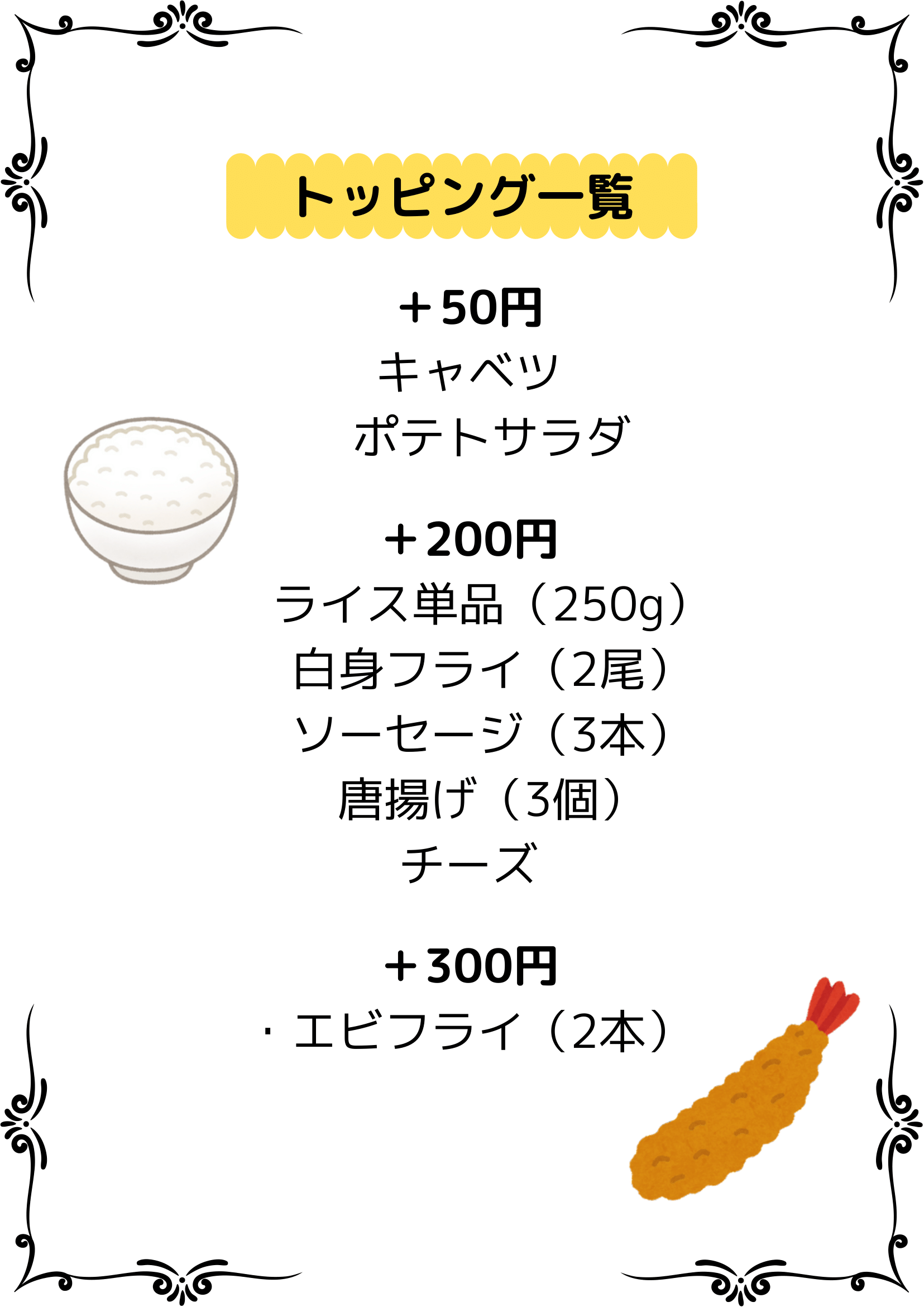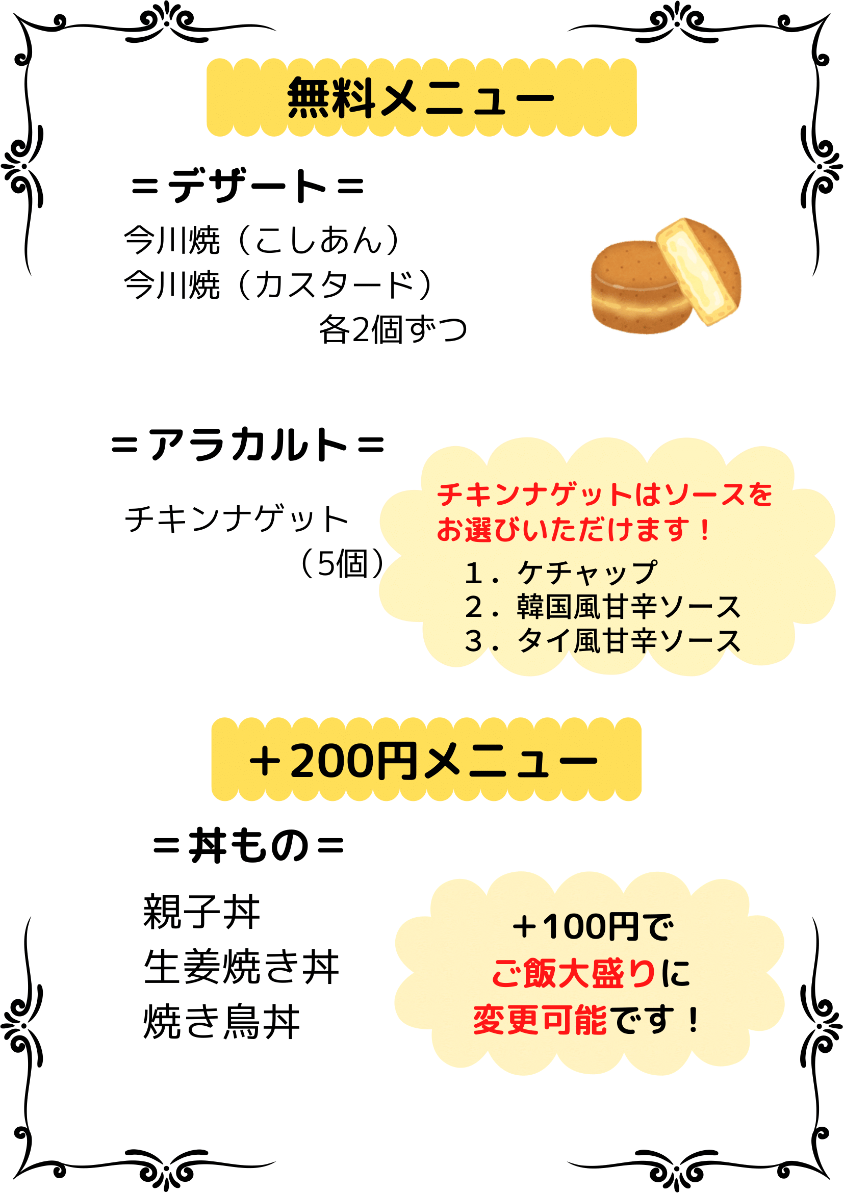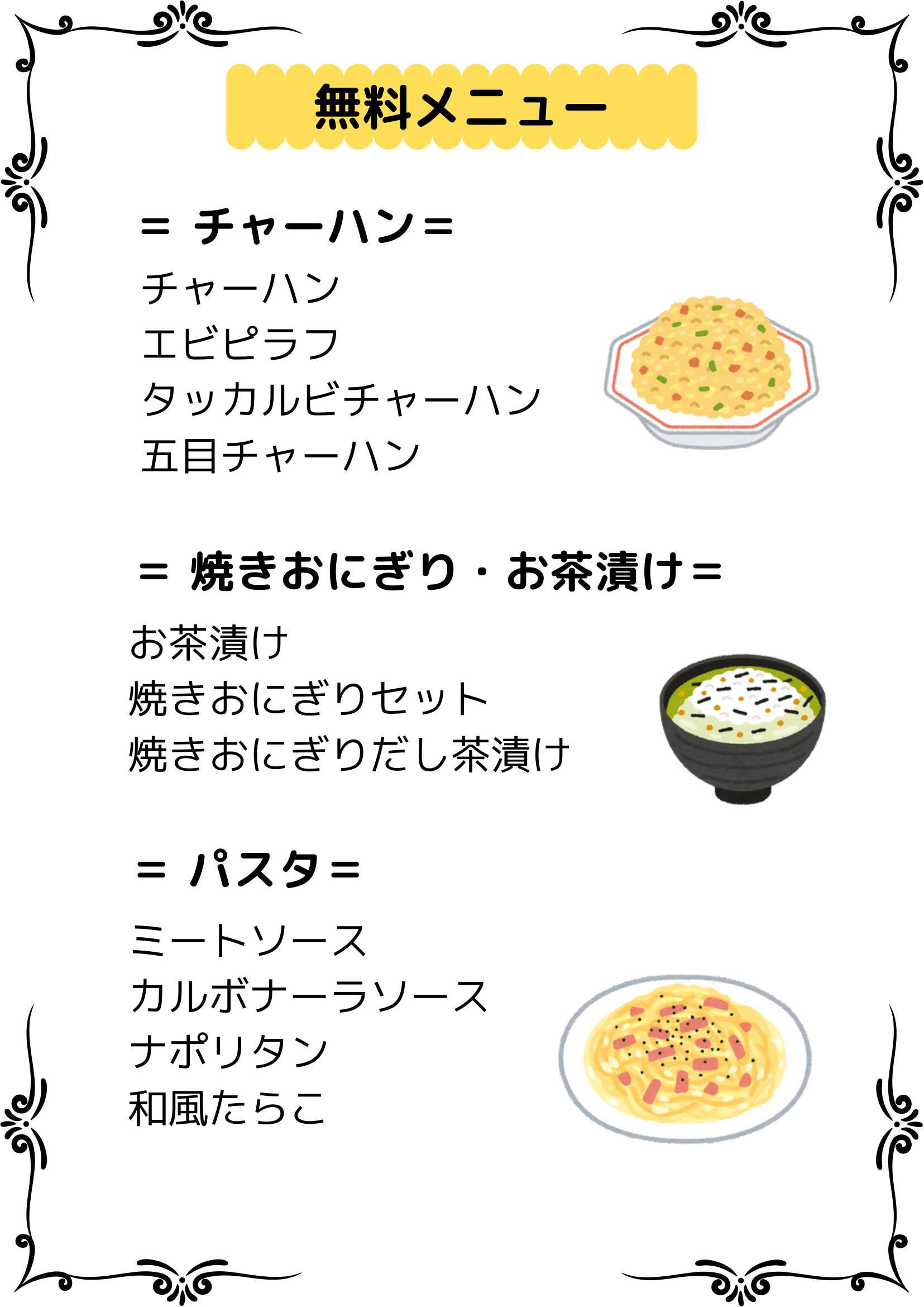- 当店は飲食物の持込み自由ですが、匂いのきついものなどはお控えください。